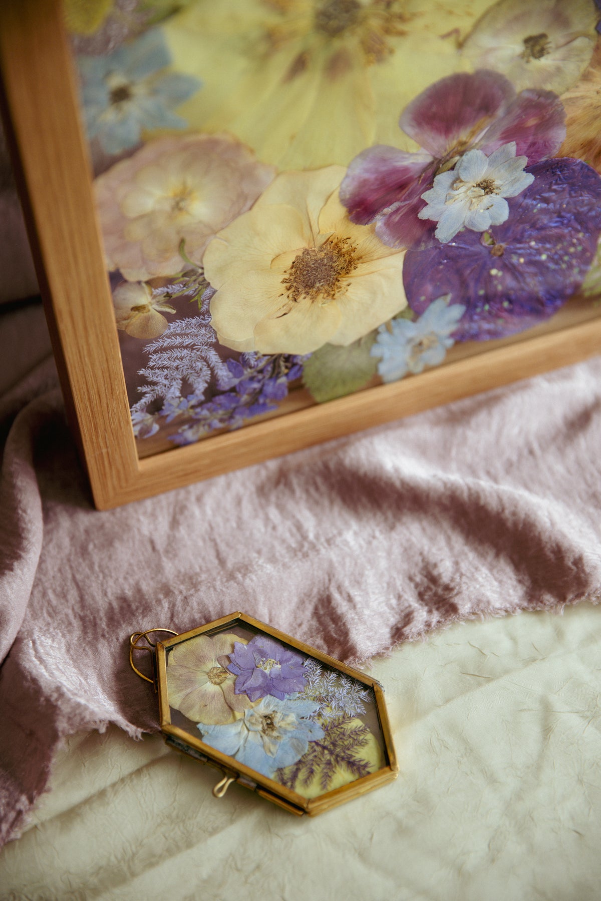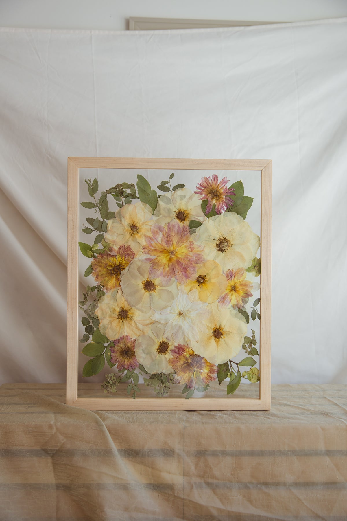 While wedding bouquet preservation is our specialty, we love getting creative and hearing all your fun flower frame ideas. We can create any size frame in any color, and press almost every single type of flower/plant. If you have something in mind that looks different than what you see on our website, give us a call! We truly love thinking outside the box and creating new unique pieces.